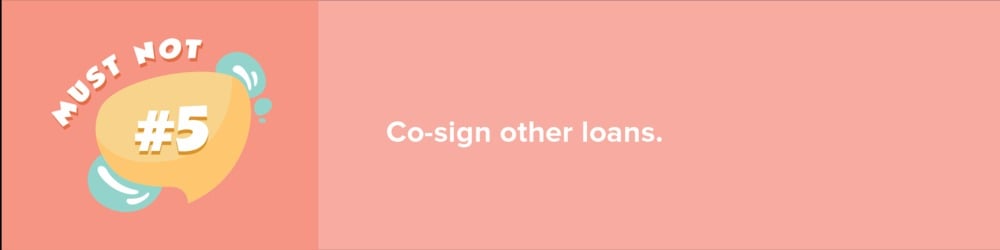Co-signing means you are agreeing to pay off someone's debts when that person fails to make payments for any reason. And while it is a generous act, especially if it can help a family member or a friend, remember that you are still obligated. And if you’re in the process of getting a mortgage, co-signing a loan is a big no, even if you swear that you’ll not be the one making payments. Co-signing is automatically a red flag in the eyes of a lender.