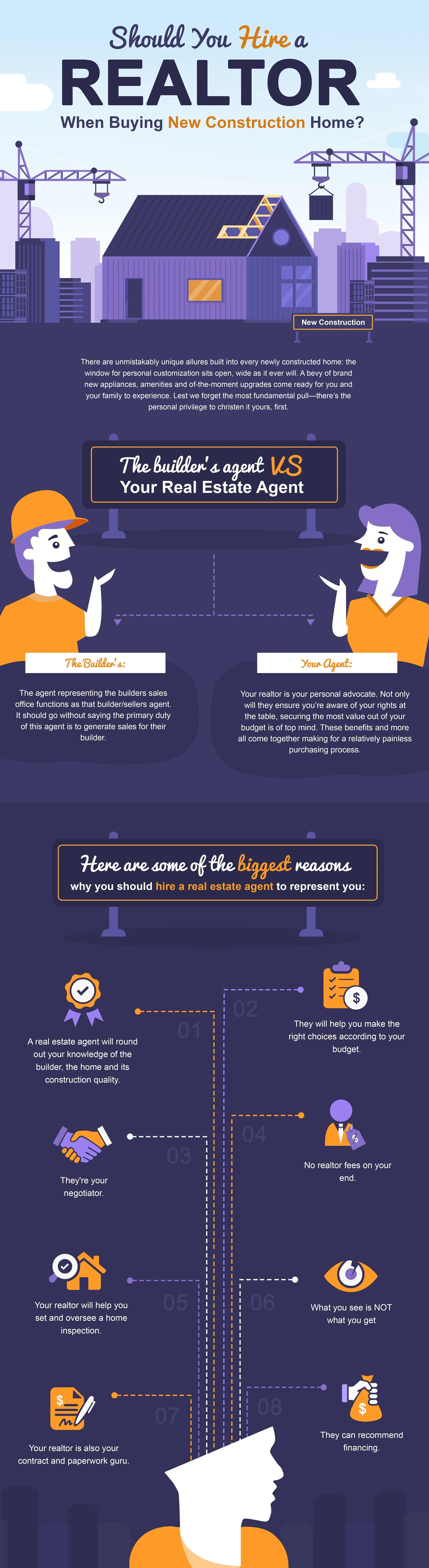 While the builder's agent is unquestionably knowledgeable, there’s a risk in relying solely on their word. You may likely be getting just a narrow, potentially biased perspective of a fuller picture. It isn’t for lack of insight, but more so about what can sometimes get lost in a property breakdown. An experienced real estate agent will be well familiar with every major area builder and their work quality, cluing you in on things that may have been omitted from the seller's agent. If you’re at all unsure of where to buy, a qualified realtor can recommend the right builder and neighborhood for you.