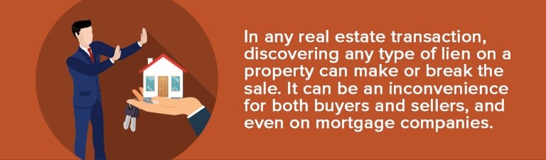 - If you're the seller, it can be very difficult to sell your property because buyers won’t purchase a home without a clear title. As previously mentioned, lenders won’t approve the purchase or agree to finance the property. Certainly, it is your responsibility to pay off the lien on your property before you may be able to sell.
